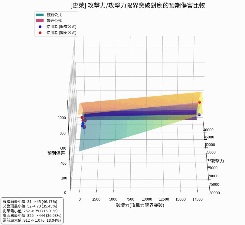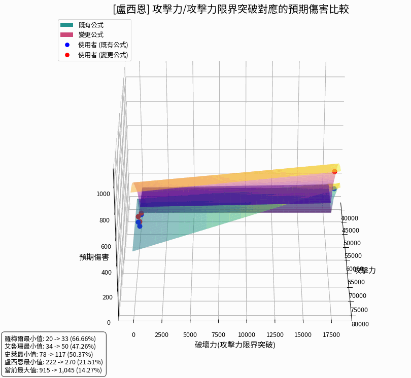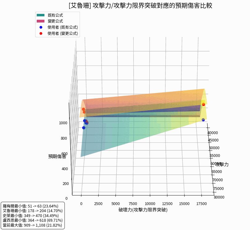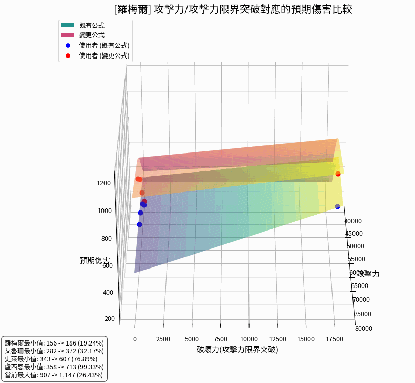 以下頁面中的 3D 圖表,立體呈現了「攻擊力」與「攻擊力限界突破(破壞力)」數值變化對預期傷害的影響。