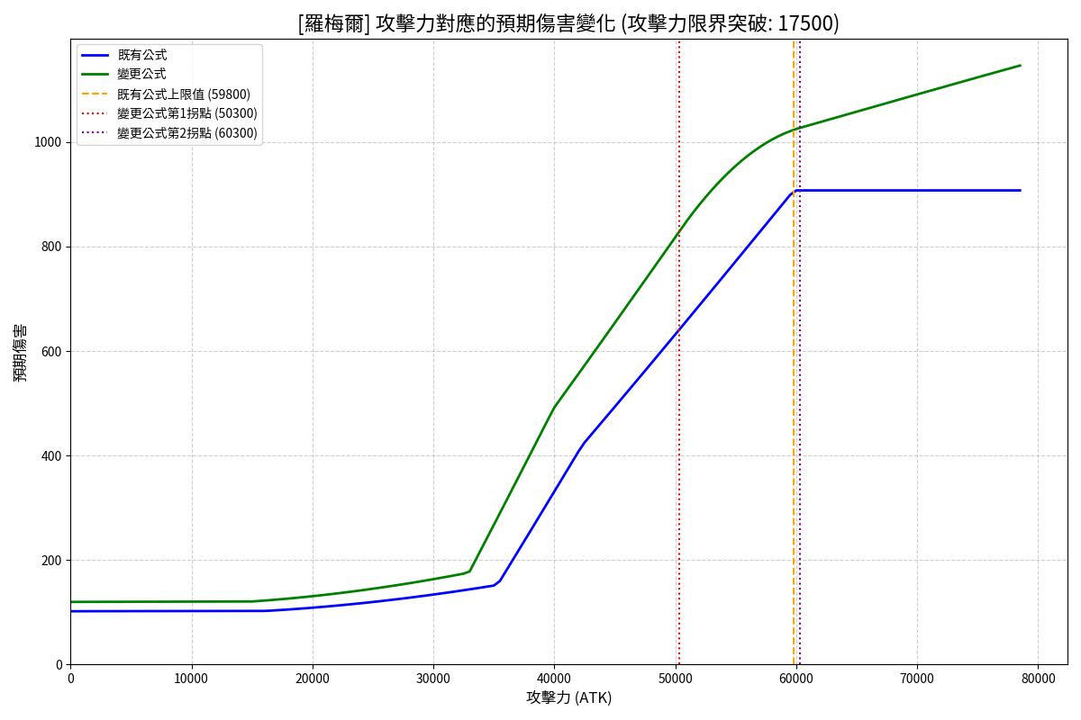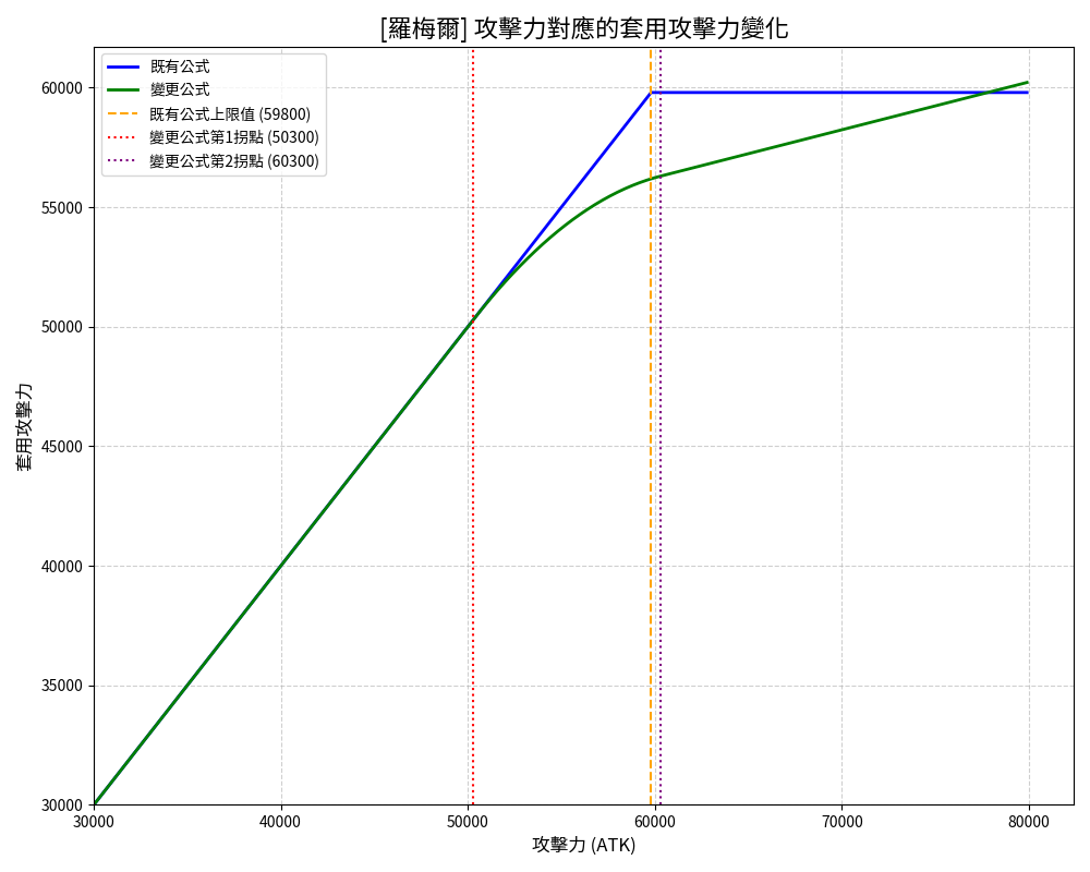 上圖藍色曲線代表舊公式,當玩家攻擊力達到 59,800 時,實際套用的攻擊力將不再上升。
