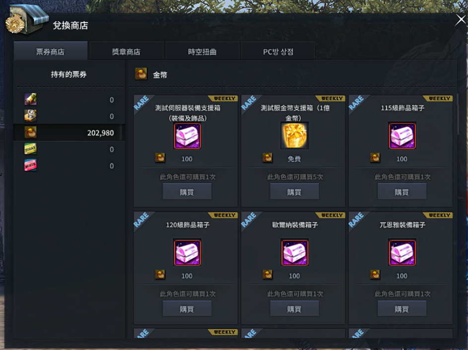 八、創立角色進入村莊後,可於 [兌換商店 > 票券商店] 內兌換直升藥水、裝備等便於測試的道具。